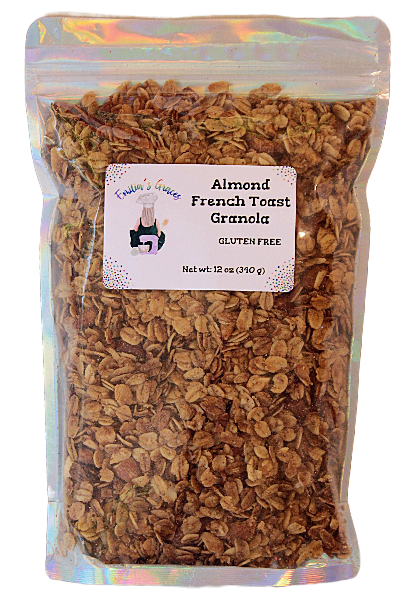 Almond French Toast Granola is inspired by my love of thick French Toast drenched in maple and dairy free buttery deliciousness, Almond French Toast Granola scales back on the sweetness and contains warming spices of ground ginger, ground cardamom, ground cloves. It’s mapley – buttery – yummy French toast with bits of toasted almonds.